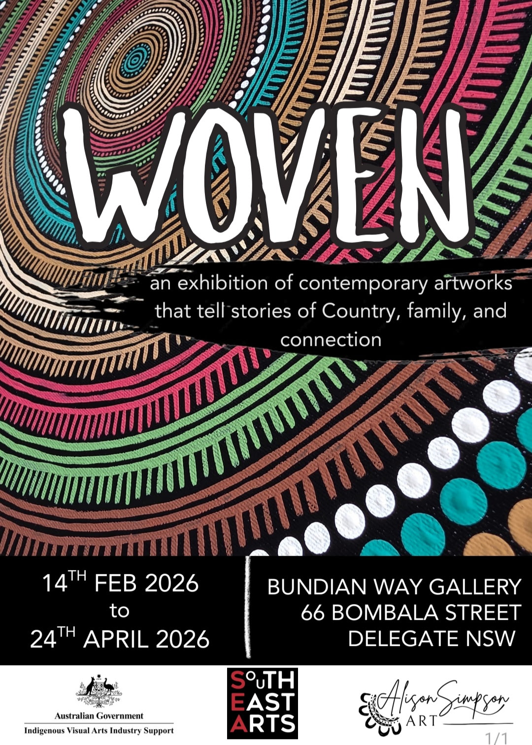 Bundian GalleryThe Bundian Gallery is a joint Venture between the Delegate Progress Association and the Eden Aboriginal Land Council. The gallery features Aboriginal Art from local and regional artists. There are four exhibitions a year. Current Exhibition is Woven. An exhibition of contemporary artworks that tell stories of Country, family and connection. The artist is Alison Simpson